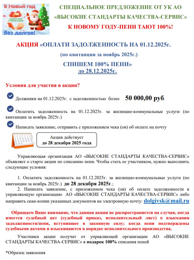 Уважаемые жители! Управляющая организация АО «ВЫСОКИЕ СТАНДАРТЫ КАЧЕСТВА-СЕРВИС» объявляет о старте акции по списанию пени. Чтобы стать ее участником, нужно выполнить следующие условия: