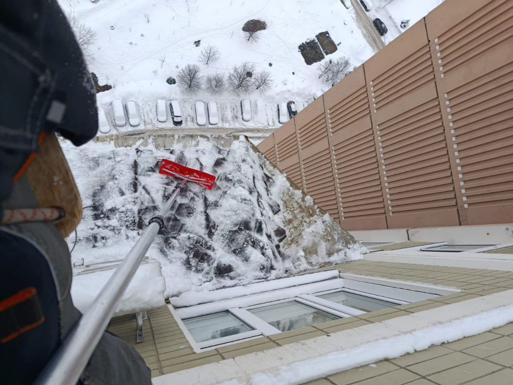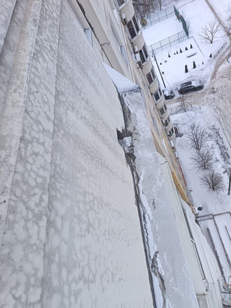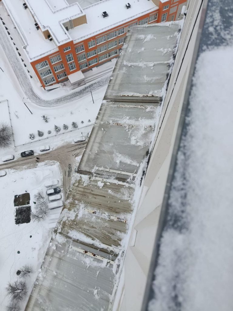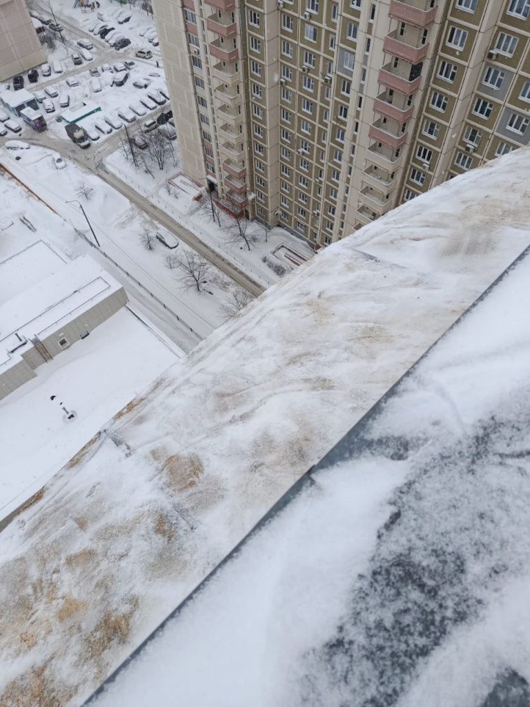 ✅ ул. Панфилова 3: очистка от сосулек, наледи и снега сливов с кровли, отливов балконов, парапетов 11 этажа всех четырёх подъездов.